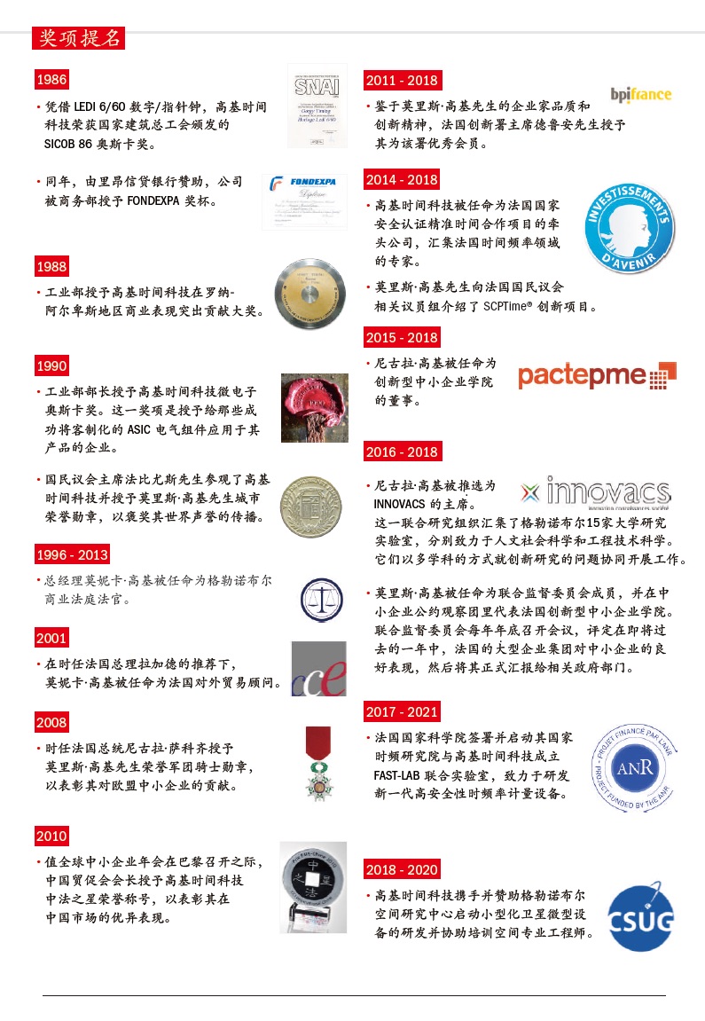 2010年,正值全球中小企业年会在巴黎召开之际,中国贸促会会长授予高基时间科技中法之星荣誉称号,以表彰其在中国市场的优异表现。鉴于莫里斯·高基先生的企业家品质和创新精神,法国创新署主席德鲁安先生授予其为该署优秀会员。