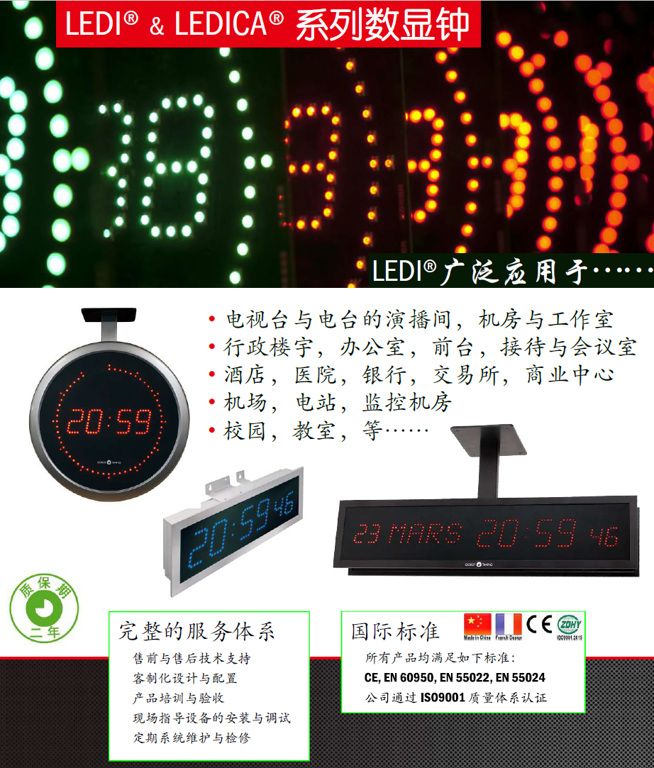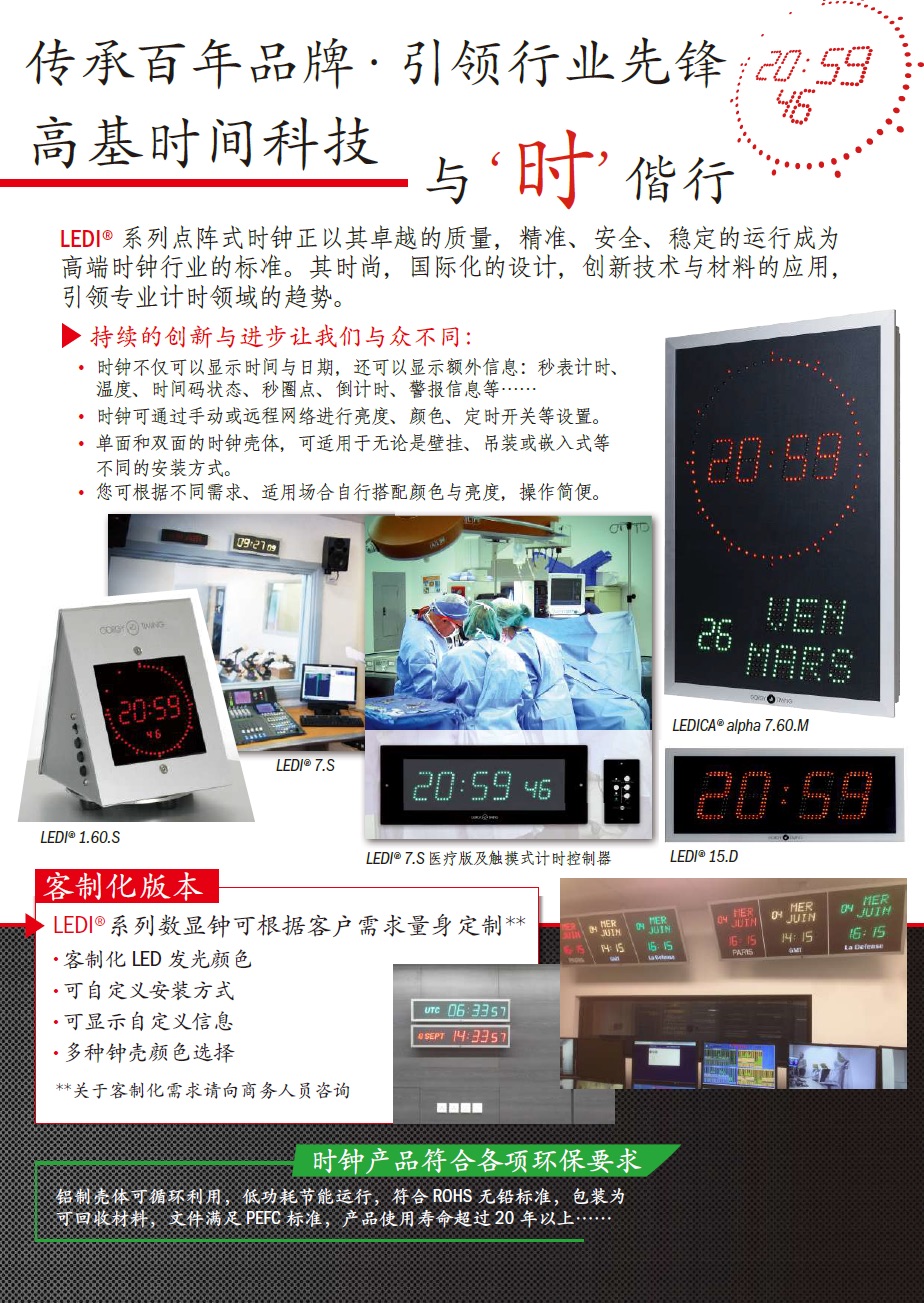 高基时间品牌LEDI® & LEDICA® 系列数显钟,采用贴片式三色LED点阵式排列显示。