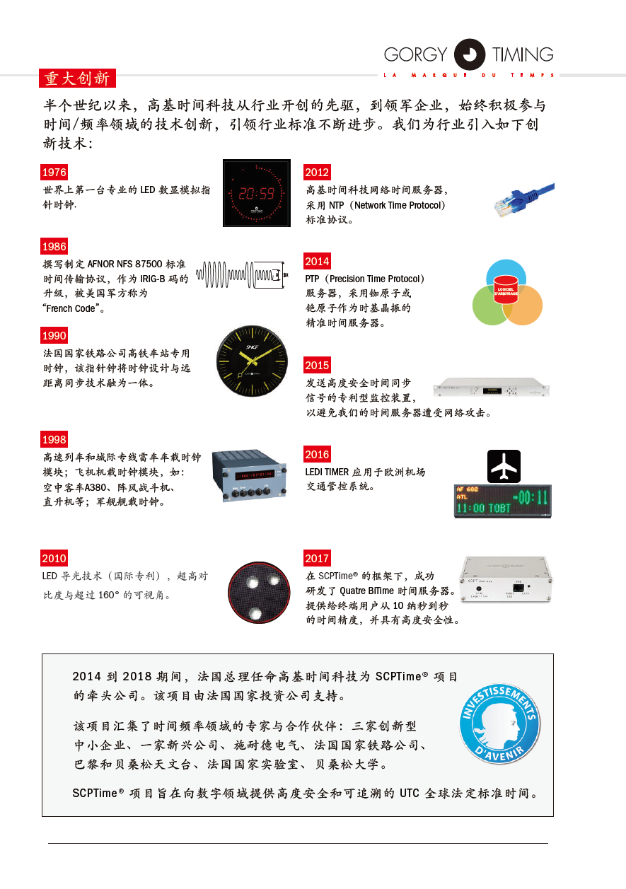 2014到2018期间,法国总理任命高基时间科技为 SCPTime®项目的牵头公司。该项目由法国国家投资公司支持。 该项目汇集了时间频率领域的专家与合作伙伴:三家创新型中小企业、一家新兴公司、施耐德电气、法国国家铁路公司、巴黎和贝桑松天文台、法国国家实验室、贝桑松大学。