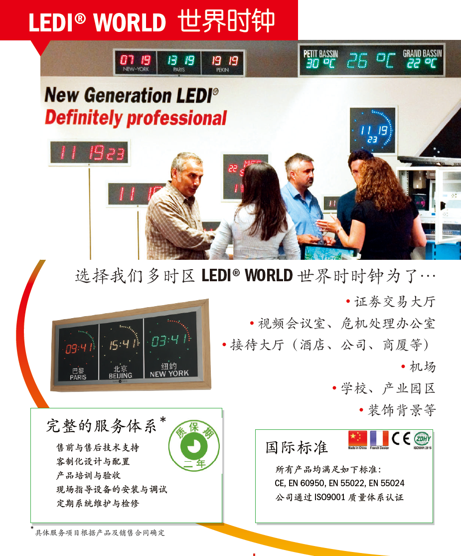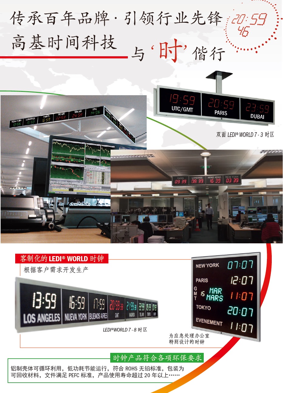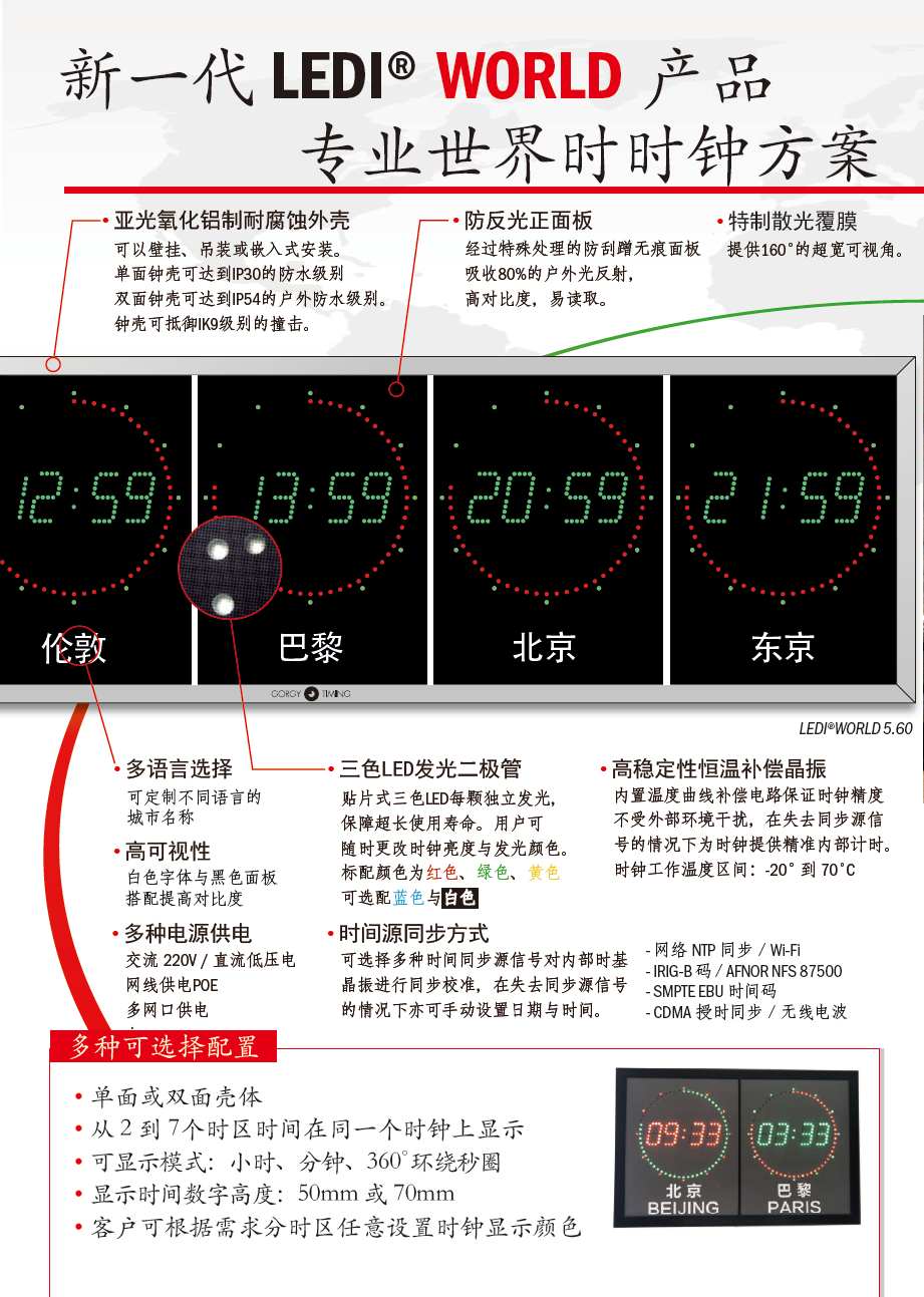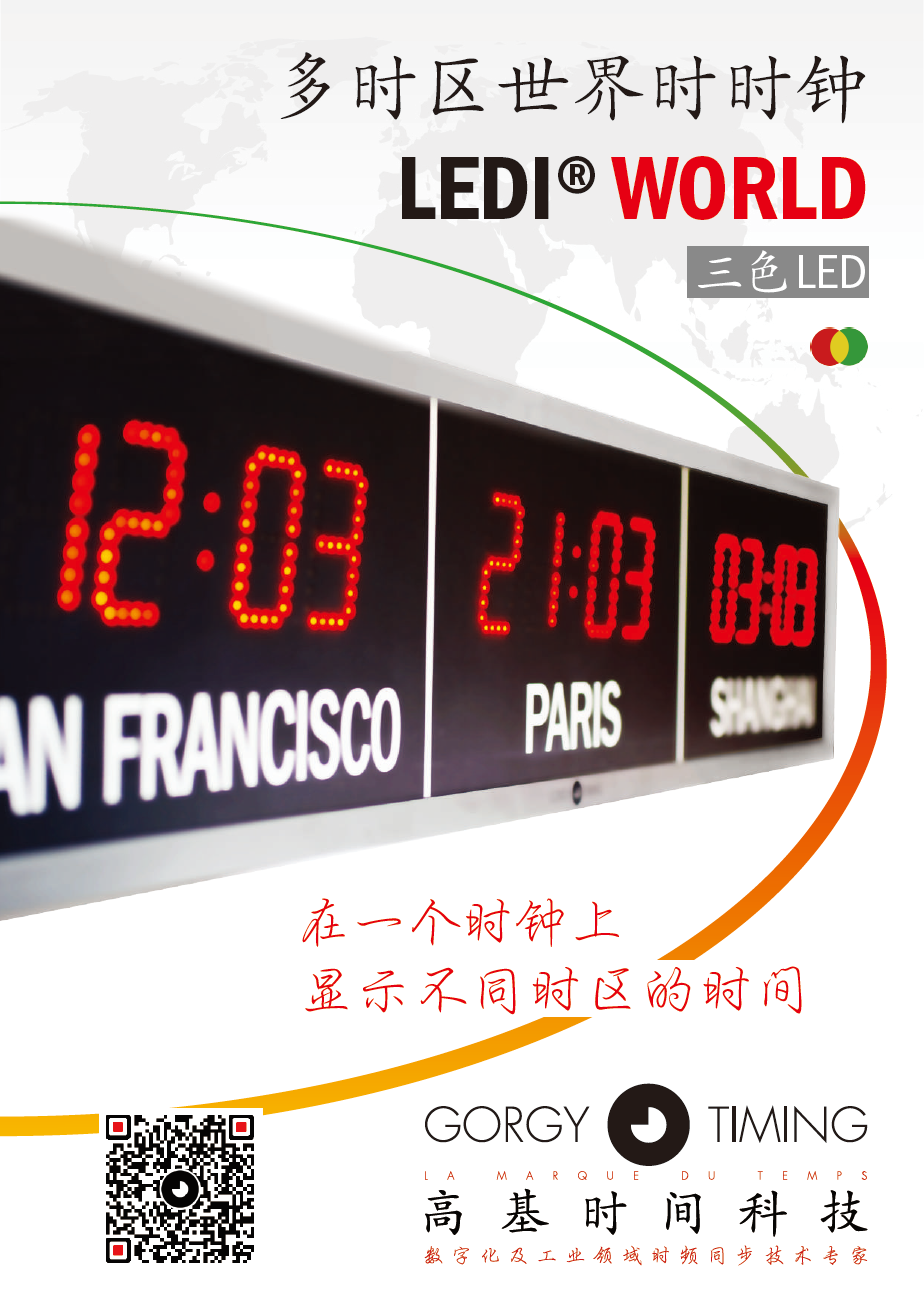 高基时间品牌LEDI® WORLD系列多时区数显钟(World Time Clock),采用贴片式三色LED点阵式显示。