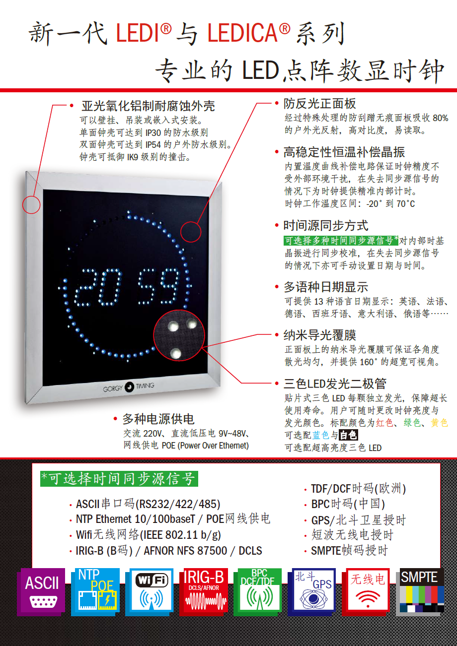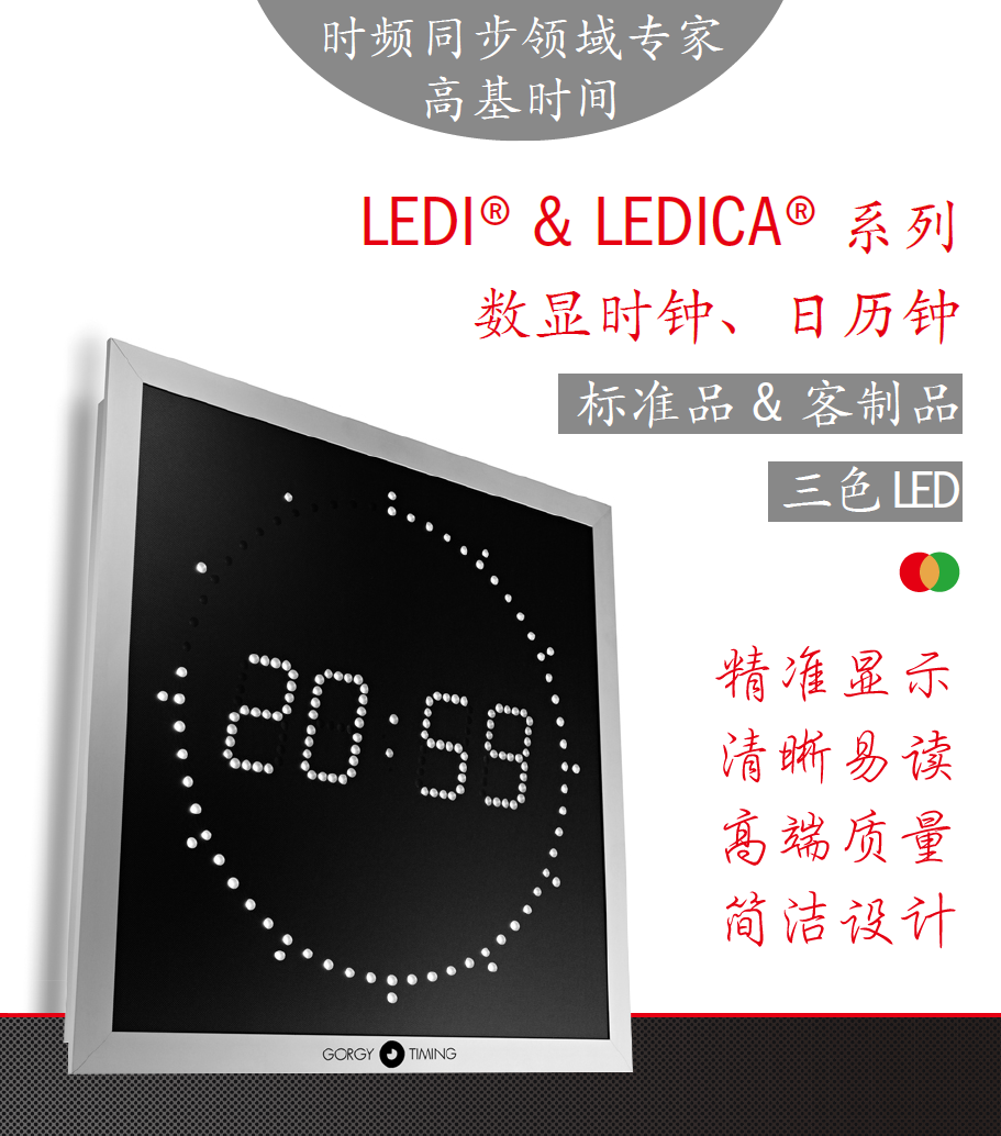 高基时间品牌LEDI® & LEDICA® 系列数显钟,采用贴片式三色LED点阵式排列显示。